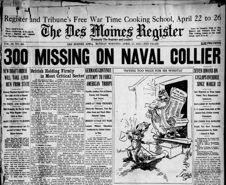 这艘船在1918年3月失踪了,它带着300人和10000个锰沉入水下,至少政府认为发生了这样的事情。