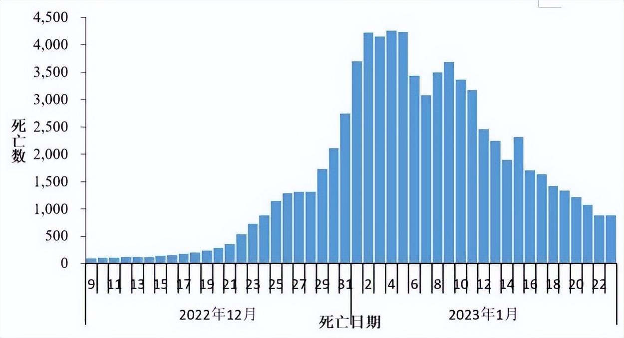 在院新冠病毒感染死亡病例数于1月4日达到每日峰值4273,随后持续下降,1月23日下降至896,较峰值下降79.0%。